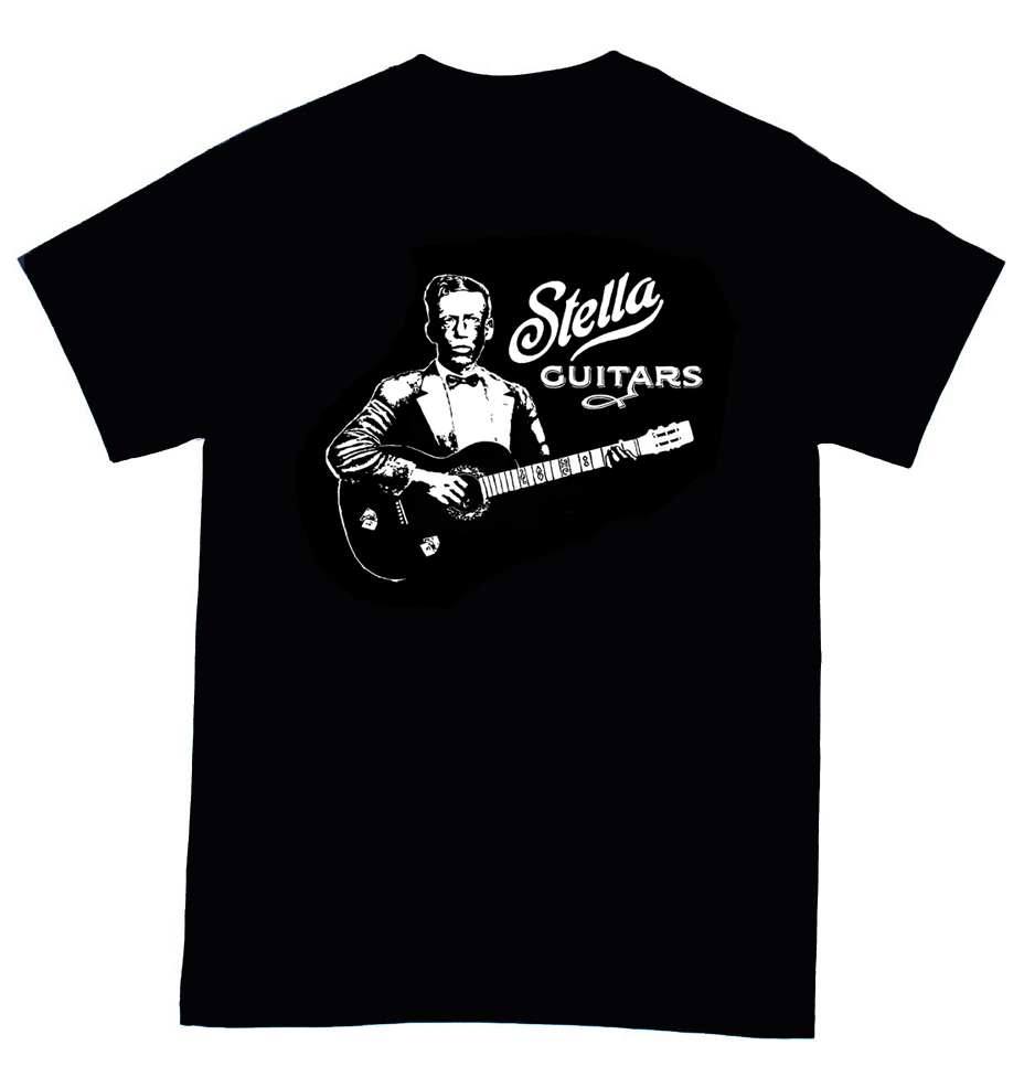 Black cotton “Stella Guitars” t-shirt with image of Charley Patton playing a Stella Gambler guitar. NEW DESIGN!